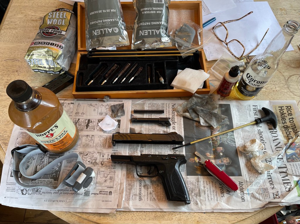 A basic Outers gun cleaning kit works great. Tighten the sections of cleaning rod hard so they don’t get loose while you clean.